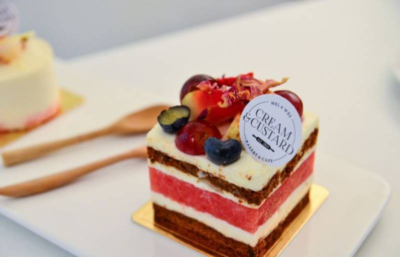 Cream&Custard的西瓜草莓蛋糕,上下两层杏仁蛋白酥皮奶油,中间裹挟著一层新鲜西瓜,蛋糕上缀着数颗草莓、蓝莓和葡萄,还洒著玫瑰花瓣屑,奶油无糖,蛋糕无糖,甜度完全来自于新鲜西瓜,确认过眼神,是“无罪甜品”无疑了。