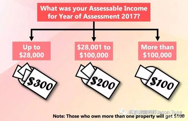 可评估收入低于28000新币的公民,可获得300新币花红;在28001新币至100000新币的公民,可以拿200新币花红;如果你的可评估收入高于10万新币,或者名下有超过1处的房产,则可获得100新币奖励。新加坡的可评估收入包括:来自贸易,商业,职业或就业等所有形式的收入以及应纳税的租金收入。