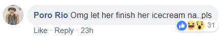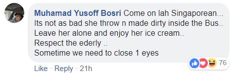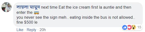 这位叫লায়লা মামুন的网友说: 下次吃完冰淇淋再上车行吗 阿姨,你难道没有看到标识嘛,在公交车内吃东西会罚款500新呢!! 而这位Chia Johan的网友则回复她 下一辆公交车需要等30-40分钟呢!交通拥挤无处不在。要等你自己去等吧!上班迟到你就高兴了!! 另外一位名叫Maslan Mohd Nahar的网友则 很逗比的回复她 人家并没有在吃冰淇淋好吗!! 她是舔冰淇淋而已 所以不算违规!