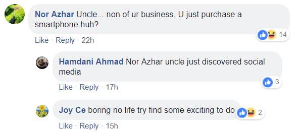 名叫Azhar的网友说: 大哥,这不关你的事好吗? 难道你是没买过智能手机吗?!不需要来炫耀你的手机功能! 而名叫Ahmad的网友则说: 他不是刚买了一部手机,他是刚刚发现了社交媒体这个新大陆,所以很兴奋 而网友Ce则觉得: 他是无聊到没事可做,想找点刺激的事情来做一下