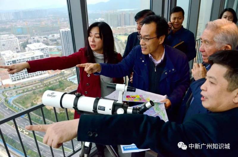 刘太格在知识城合资公司有关负责人的陪同下,登上绿地-广州开发区人才工作集团大厦俯瞰整个知识城南起步区。图/中新广州知识城