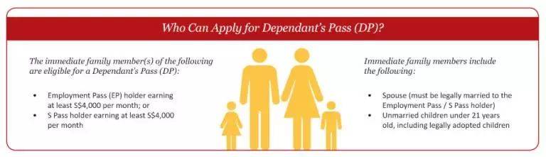 EP持有人在新加坡工作的月薪超过6000新币,即可为配偶、未满21周岁未婚子女申请家属准证DP。月薪超过12000新币,即可为主申父母申请长期社访签证(Long term visa pass)