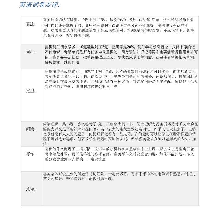 这是一张培训班老师对学生英语试卷点评的截图,可以看到,老师每个题型进行了详尽的点评,从审题到失分原因,再到建议,应有尽有!