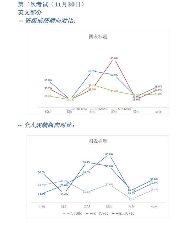 这是一张英语成绩变化的折线统计图,可以看到,不仅有班级成绩的变化,而且就连个人成绩的变化也有清晰的呈现。