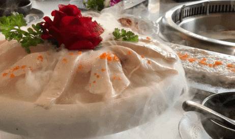 海鲜四选一,鲜切的神仙鱼片,放在冰块上,云烟笼罩,晶莹的鱼籽配上鲜花诚如《天龙八部》中所言“鱼虾肉食之中混以花瓣鲜果,颜色既美,自别有天然清香”。