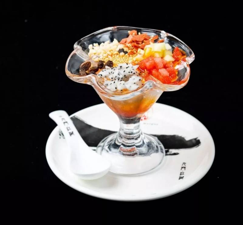 甜品可选一份,“冰粉”是中国西南地区的一道著名甜品,是用冰粉树的籽揉搓出来的。五爷手工冰粉爽滑、透明、美味的“天然果冻”。