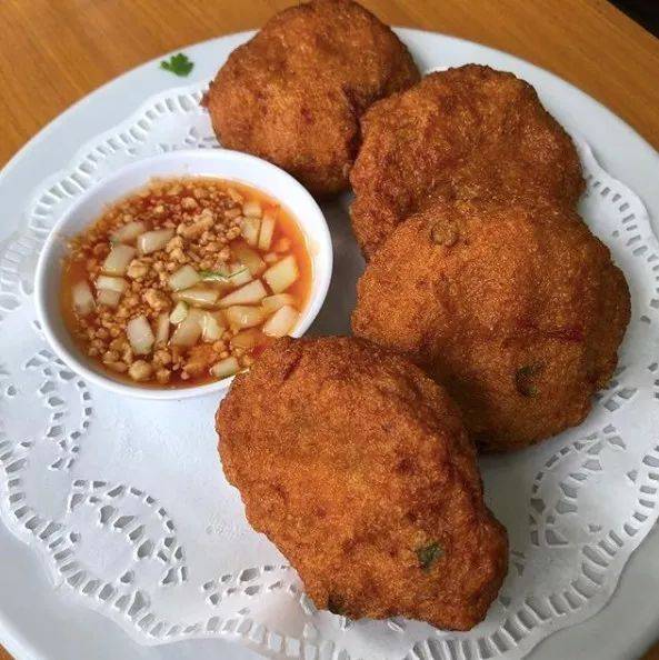 泰式海鲜东炎汤是必点的一道菜,口感酸爽,最适合在闷热天气里没食欲的人点来开胃。绿咖喱偏辣,右边的手工鱼饼则非常嫩滑,配上泰式酱汁鲜香酸甜。