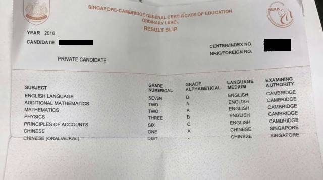 有图有真相!这是一位来自中国的私立学校考生的O水准成绩单,总分为15分,且英文分数为D7(不及格)。以2016年的标准,这样的英文成绩,基本不大可能有公立学校上,但是他去年收到了来自淡马锡理工学院、共和理工学院和实龙岗初级学院的Offer,并最终选择去淡马锡理工学院就读绿色建筑专业。