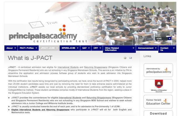 J-PACT考试,又被称为校长协会考试,是初级学院的入学考试,但O水准考试还要照考。J-PACT主要考数学(两个试卷共220分钟)和英文(试卷120分钟,没有口试)两个科目。每年10月至11月间考试,一个月后出成绩。