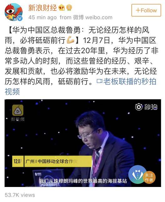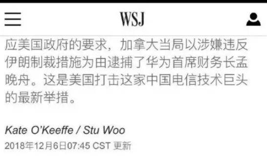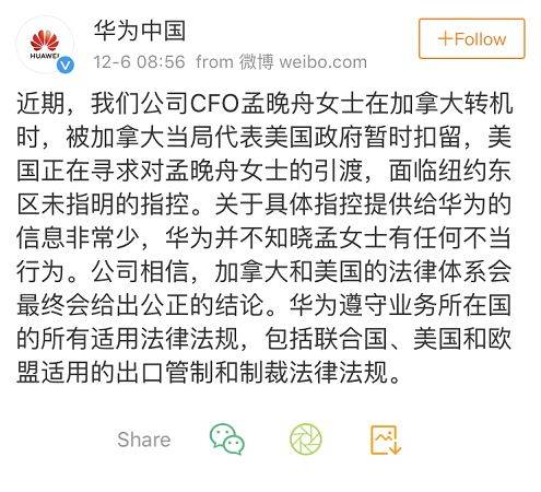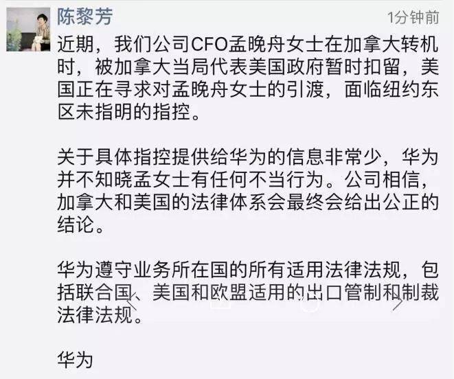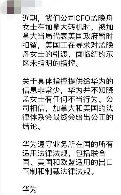 “近期,我们公司CFO孟晚舟女士在加拿大转机时,被加拿大当局代表美国政府暂时扣留,美国正在寻求对孟晚舟女士的引渡,面临纽约东区未指明的指控。