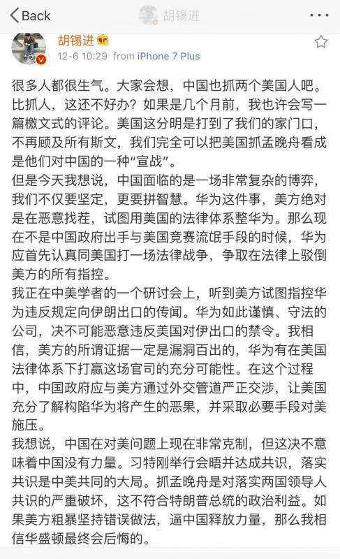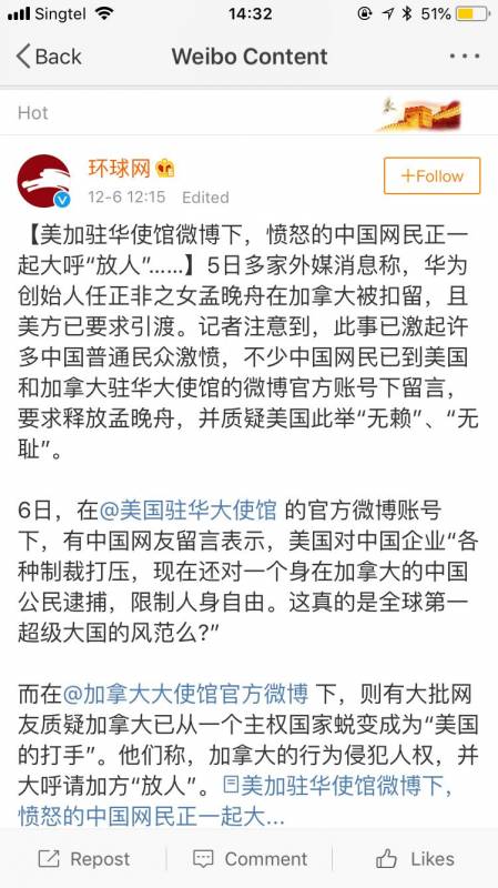 “加拿大警方应美方要求逮捕一个没有违反任何美、加法律的中国公民,对这一严重侵犯人权的行为,中方表示坚决反对并强烈抗议。中方已向美、加两国进行了严正交涉,要求它们立即纠正错误做法,恢复孟晚舟女士的人身自由。我们将密切关注事态发展,采取一切行动坚决维护中国公民合法权益。”