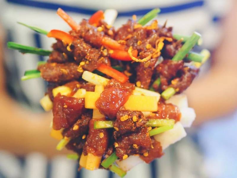 首先是这道外婆酥肉,酥肉炸得香脆可口,重点是面粉不会过多能吃到扎实的肉,调味的辣椒面味道也很够劲。