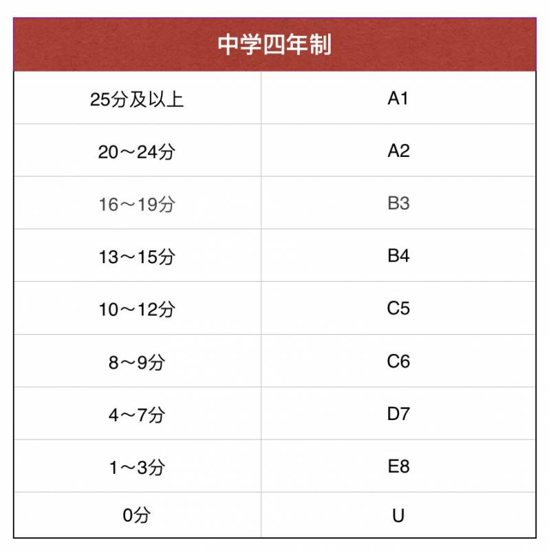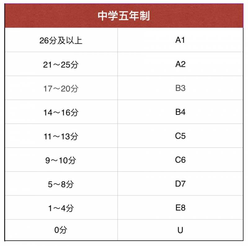 学生在4-5年中学学业结束时,将上述5类计分总合,并换算成等级如下