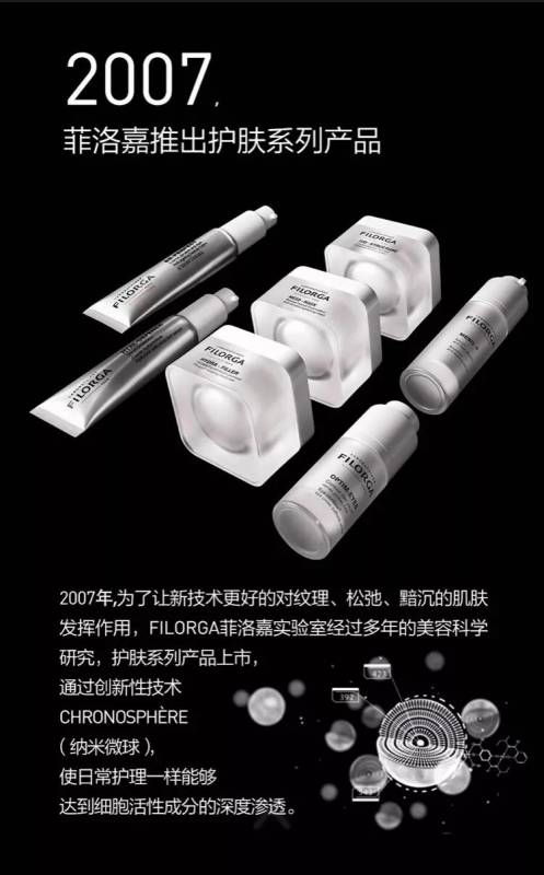 后来,为了让更多人能够通过涂抹的形式获得和针管注射同样效果的护肤,菲洛嘉研发了CHRONOSPHERE 技术,它能够智能携带NCTF这个成分进入深层肌肤,然后定向释放NCTF。由此,菲洛嘉进入日常护肤领域。