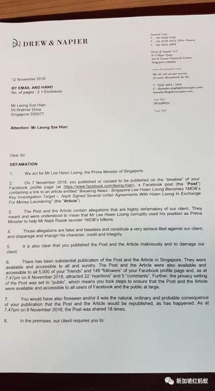 11月12日,也是就梁实轩转发不实报道的五天后,代表李显龙总理的德尊律师事务所(Drew & Napier)向梁实轩发出索偿信(Letter of Demand),要求对方公开道歉和赔偿当事人的损失。