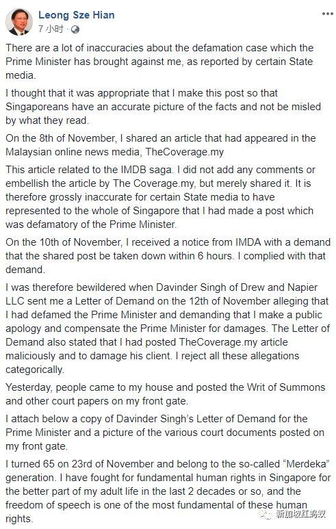 他称,自己是在11月8日分享“TheCoverage.my”的文章。他强调,自己没有加入任何评语或润饰,所以,官方媒体告诉全体新加坡人,他发了一个诽谤总理的贴文的说法是“非常不正确”的。