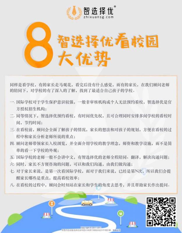 其次,可以考察学校的设施。比如,孩子热爱喜剧表演,则可选择一所更加注重艺术培养,拥有完善剧院的学校。家长们可扫下图二维码,通过智选择优预约参观国际学校。