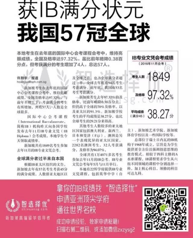 就2016年IB成绩来看,新加坡IB课程考生及格率占97.3%,而全球平均及格率只有70%。全球考获满分考生中有6成来自新加坡。除此之外,新加坡考生的平均成绩是38.27,也比全球考生29.21的平均成绩高出近10分。