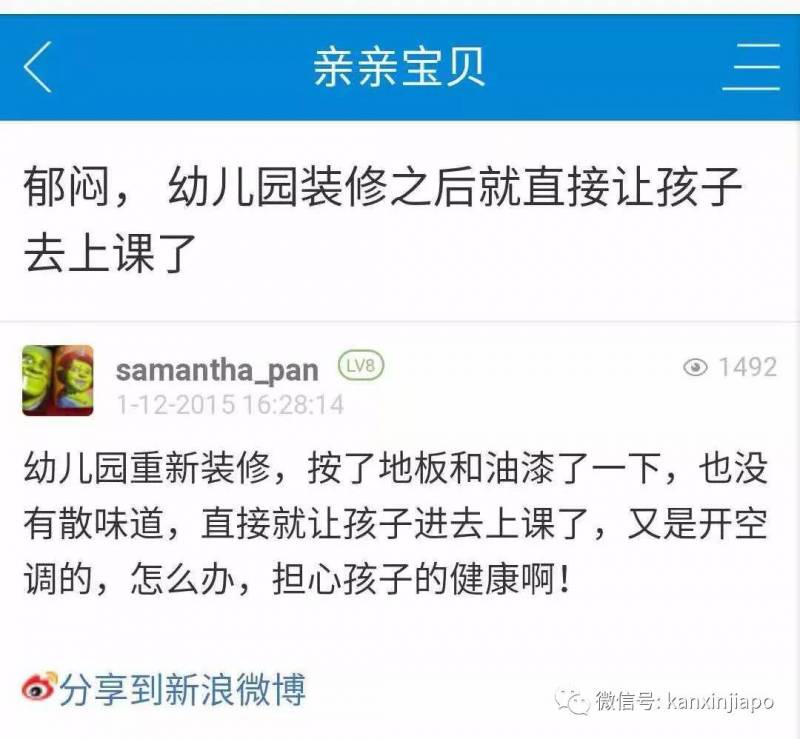 其实,整个新加坡社会对于甲醛不像中国那么敏感。我看到周围的新加坡邻居,一般都是装修完第二天就直接住进去了,好像完全没有担心甲醛问题的。在论坛上我有看到,新加坡幼儿园都是装修完就直接上课了!