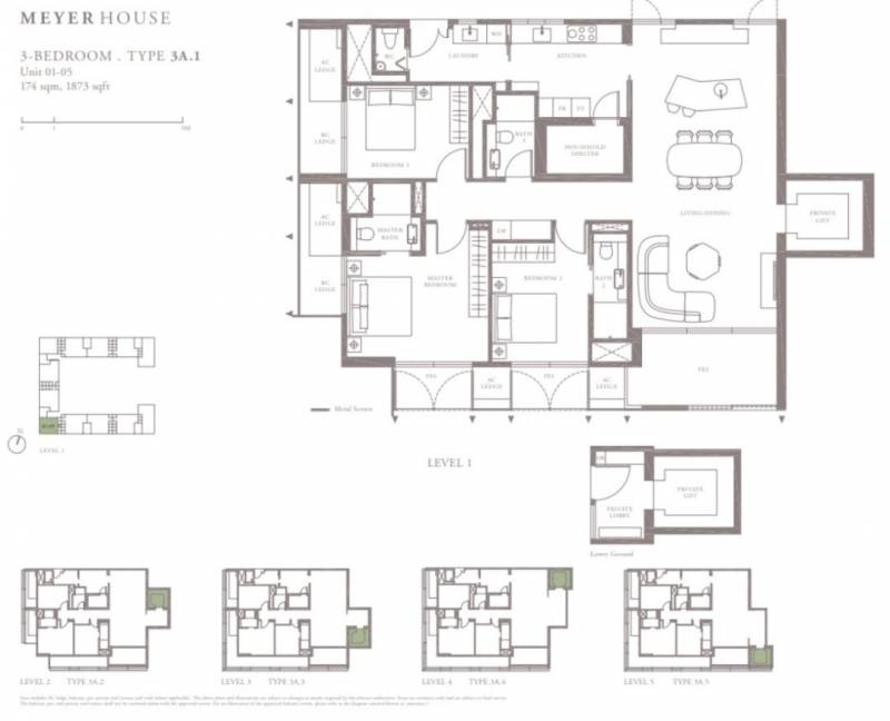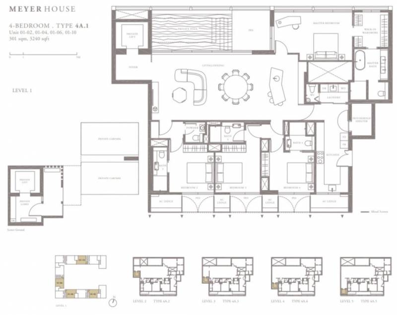 四卧室,套内面积301平方米(3,240平方尺),该户型是MeyerHouse公寓的主要房型,是一个超大气的设计,豪华四卧室配备私人电梯。厨房相对宽敞,并有专门的洗衣间和储藏间。餐厅与客厅相当宽敞,并配备私人泳池和阳台。主人房还配备一间步入式衣柜,其余三间房均配备一个内置衣橱,所有房间均配备独立卫生间,并有各自的全封闭式阳台(PES)。主人房配备大型浴缸。这样的户型很适合有多个孩子或与父母同住的家庭,或出租给相应的高端人士。