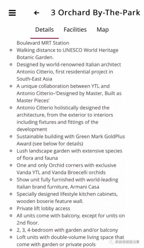 3 Orchard By-The-Park 的所处地段占地约5,777平方米,永久年地契,项目在2017年7月5日以取得临时入伙准证。项目包括3栋25层高的建筑,项目共有77个单位,包括14个两卧房单位、33个三卧房单位、26个四卧房单位、2个三卧和四花园套房单位和2个四卧和五卧阁楼单位。