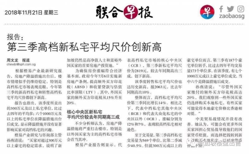 根据橙易产业最新研究报告,房地产降温措施出台后,新加坡楼市情绪似乎仍维持稳定,特别是高档私宅市场表现亮眼,今年第三季的新高档私宅和转售高档私宅平均尺价都创下新高。