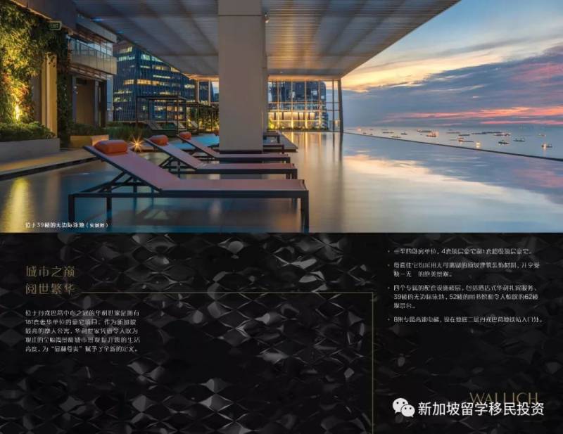 除了Wallich Residence所在的优越地理位置以及其周围众多的酒吧和餐厅,同时毗邻日益流行的Duxton Hill,Club Street和Ang Siang Hill。 Wallich Residences坐落在新加坡全岛最高的建筑内,并且充分利用它的高度。作为181间豪华公寓的主人,都可以从特别建造的观景台上鸟瞰整个城市的壮丽景色。 并且从其巨大的无边泳池可以眺望180米外的大海。绝对在享受的同时,彰显尊贵!
