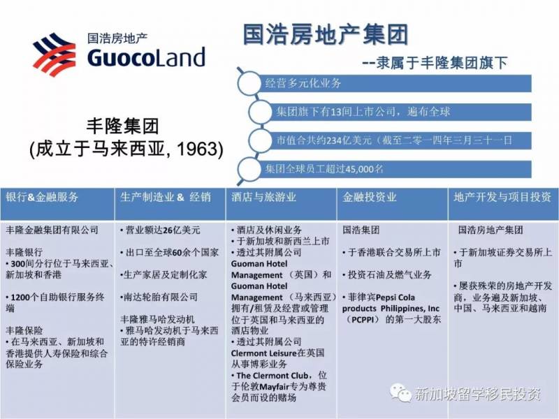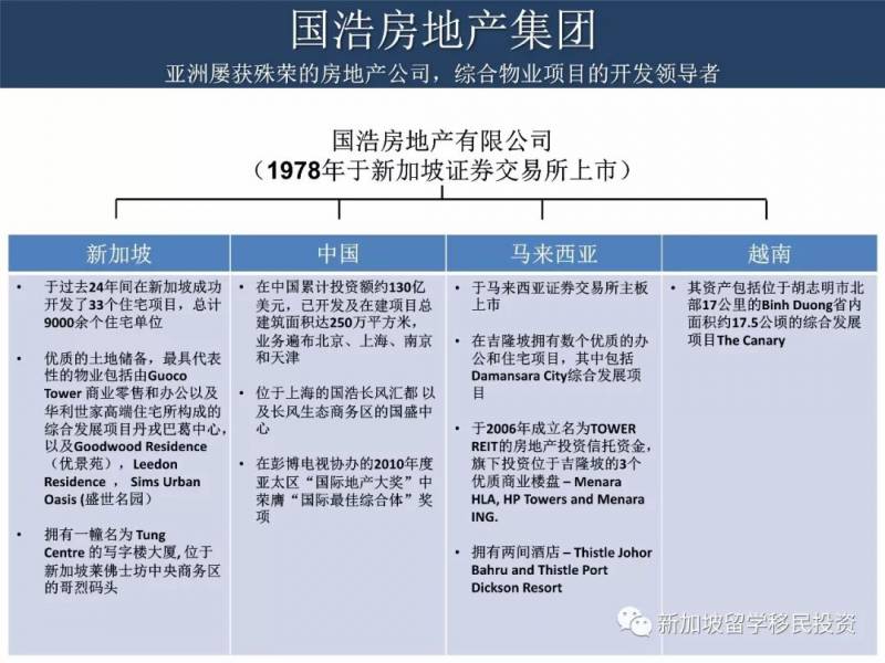 在新加坡,集团已成功开发了35个住宅项目累计约1万间公寓和住宅和成功开发了其旗舰综合发展项目丹戎巴葛中心。这座雄心勃勃的“垂直城市”集商业、住宅、零售、酒店和市区公园于一身,作为全新的区域地标。在中国,集团已竣工和开发中的房地产项目遍布多个主要城市如北京、上海、南京和天津。在马来西亚,集团持有65% 股份的其中子附属公司 - 国浩房地产(马来西亚)有限公司是在马来西亚证券交易所上市的大型房地产公司,在总体城镇规划,高档住宅与商业项目开发等领域拥有丰富经验。