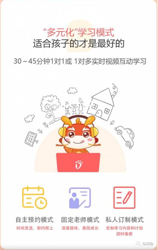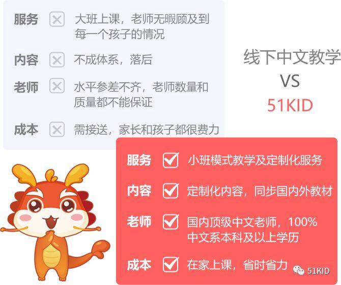 51kid对比线下中文教学优势明显。线下教学不论大班小班,老师都无法顾及每一个孩子的每一分钟,孩子容易走神,课堂效率直线下降;而51kid1对1个性化学习,实时互动,保证孩子注意力集中,学习效率也随之提高。并且海外的中文教师水平参差不齐,找到一个专业可靠的中文老师不易,即使找到了也常常难有档期可预约;而51kid的老师均为中文教育顶级水平,中文教育相关专业,能给孩子更明确、更可靠的学习指点。并且线下学习受时间地点限制较多,家长更需要频繁的接送,既消耗精力,又占用孩子和家长的时间;而51kid在线学习,只要在家有网就能上课,家长为孩子自主预约上课时间,即约即上,每节课30-45min,高效学习,也能保持孩子对中文学习的持续热情。