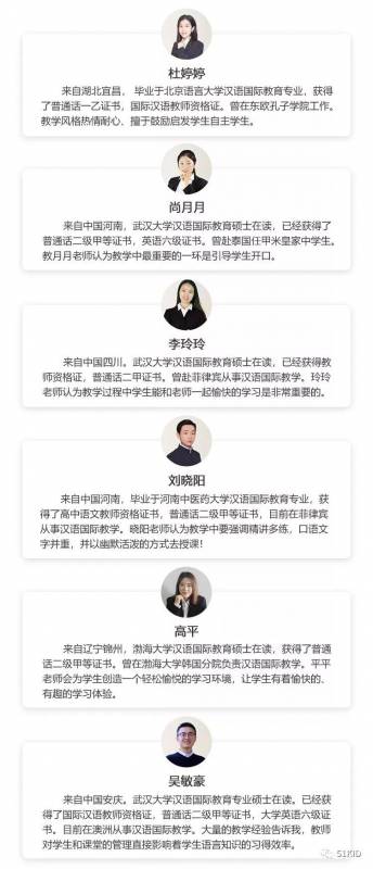 51kid的中文老师均是国内顶级水平。51kid承诺,所有教师均具备普通话二级甲等或以上水平。100%本科及以上学历,50%以上为硕士学历,40%+具备国际教学经验。更有国内顶尖的中文教育专业博士生导师顾问为课程赋能。