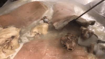 大块的猪肉放在锅中需要先煮2-3小时,再小火慢炸2-3个小时,一点点炸出厚厚的脆皮。泡在鲜汤中,配上软糯的米线,口感相当不错,这样的肉块叫做过桥米线中的“大荤”。