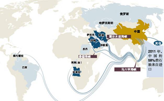 中国的能源特别是石油,主要来自于中东,而原有从中东运到中国,原来的话,千古华山一条路——必须穿过马六甲海峡。目前世界石油的60%、中国大陆80%进口石油,要经过新加坡的马六甲。也就是说,马六甲海峡直接扼住了中国经济发展的能源大动脉与咽喉。