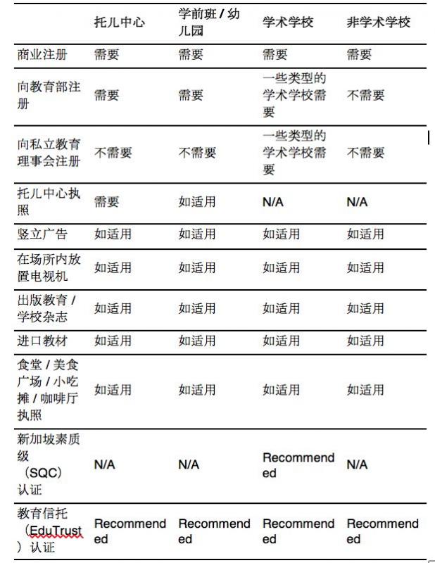 由于教育行业具有吸引力且商机无限,越来越多人士和外国组织纷纷寻求透过开办学校教学或非学校教学的私立教育机构、幼儿园、托儿所等方式和其他相关方案来加入该行业。为了达致提升教育水平及参与者素质的目标,新加坡政府为新加入教育市场者制定了具体的规则和法律标准。