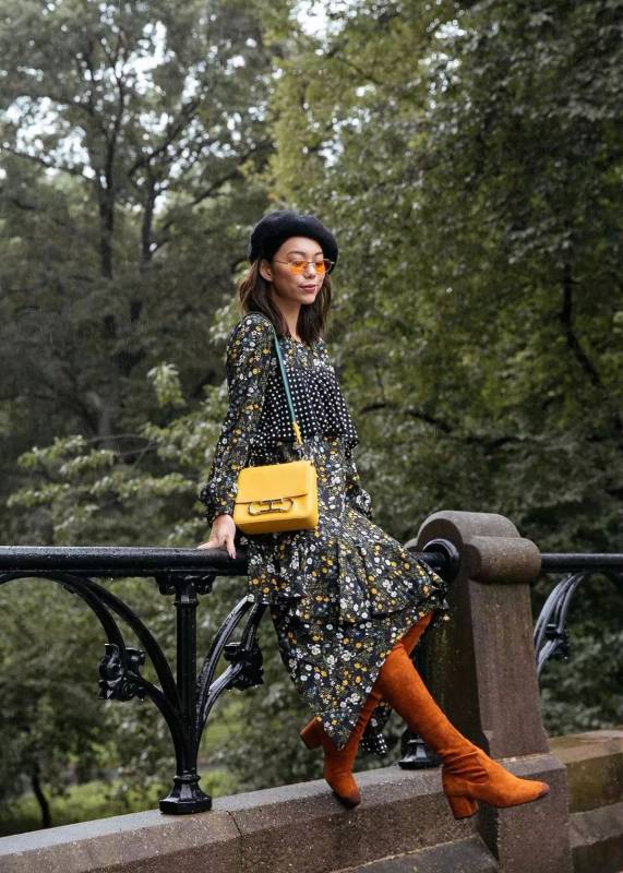 碎花连衣裙+过膝靴算是比较大胆的搭配了,个性的妹子可以尝试看看。