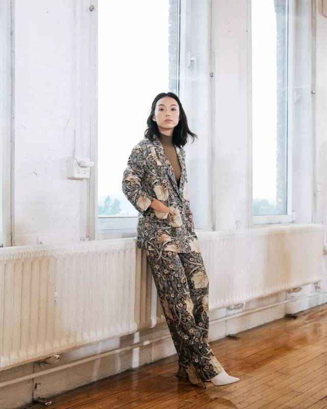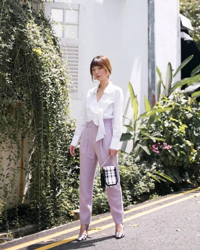 想要出彩一点的可以选一件稍有设计感的衬衫配上彩色西装裤。Andrea选择了一条今年很流行的薰衣草紫色裤子,超好看。