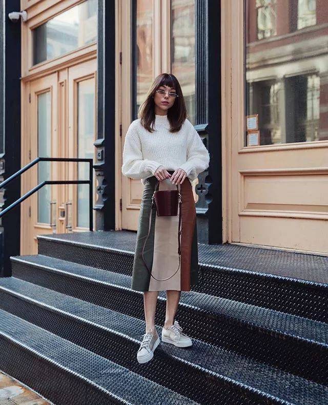 作为一名时尚博主,她的穿搭一点都不夸张,所有单品都日常到不能再日常,小个子可以借鉴。毛衣+A字裙,显高显瘦。