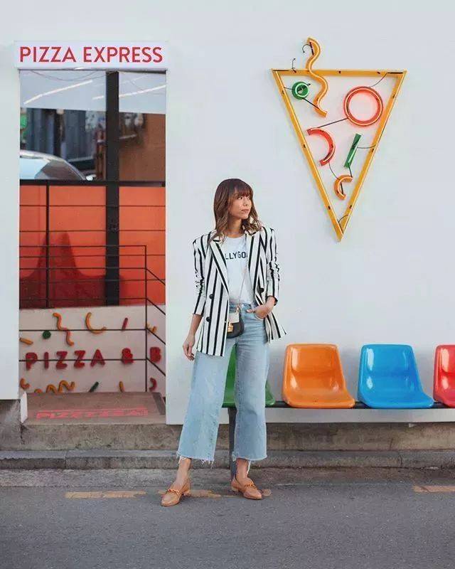 因为平时也需要出现在商务场合,Andrea的OL造型也蛮精彩的。休闲的一点的可以穿条纹西装外套+阔腿裤。