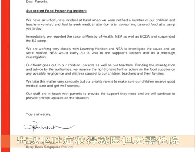 受影响学前教育机构Busy Bees给家长发了交代这起事件的一份信。信中提到,好几名师生在学习营吃了食物后,开始呕吐,需要求医。