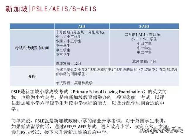 PSLE就是新加坡政府小学的结业升学考试。对于外国学生来讲,如果低龄留学的话,通过AEIS/S-AEIS考试,进入政府小学,读完小六,方可参加PSLE考试,接下来升读新加坡的政府中学。