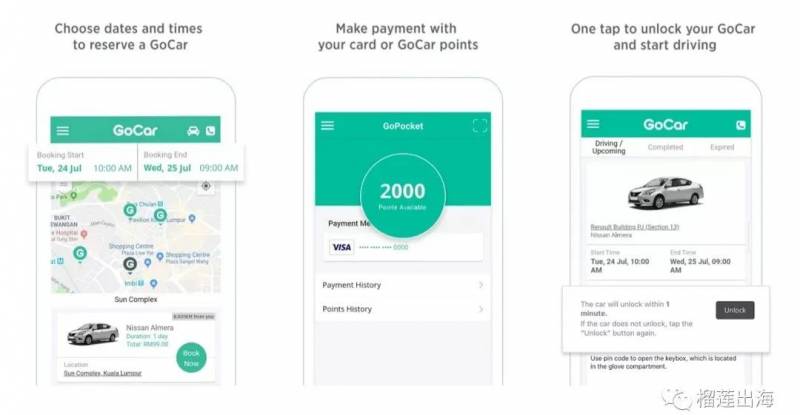 GoCar目前在马来西亚5个州的230多个地方可以使用:Selangor (雪兰莪州),Wilayah Persekutuan (联邦直辖区),Kedah (吉打),Johor (.柔佛),Penang (槟城)等等。覆蓋率比SoCar高很多。用户直接在App选好车辆预约时间和地点,用银行卡或者GoCar积分支付。预约当日可以直接解锁汽车,开始驾驶。