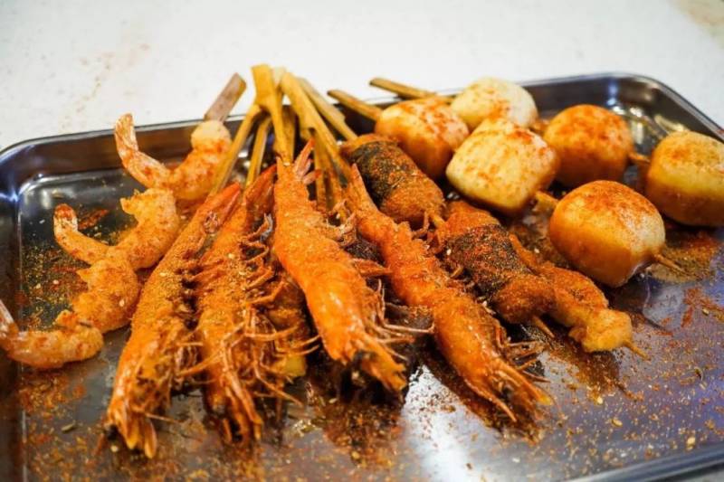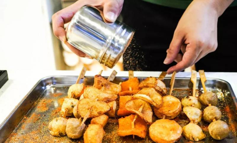 会依次撒上孜然粉、辣椒粉和胡椒粉