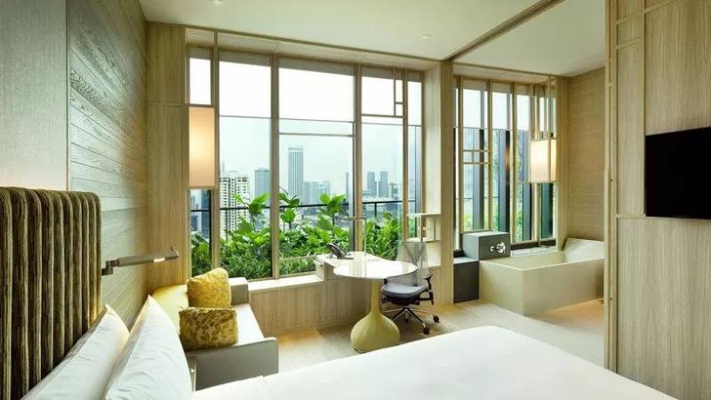 酒店房间走日式简约风。酒店毗邻牛车水,美食多种多样。如果想过一个简约不简单的周末,来这里没错了。