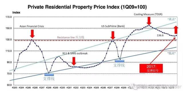 首先新加坡从1993年到2017年的房价指数图大家了解一下。这几年经过了几波走势