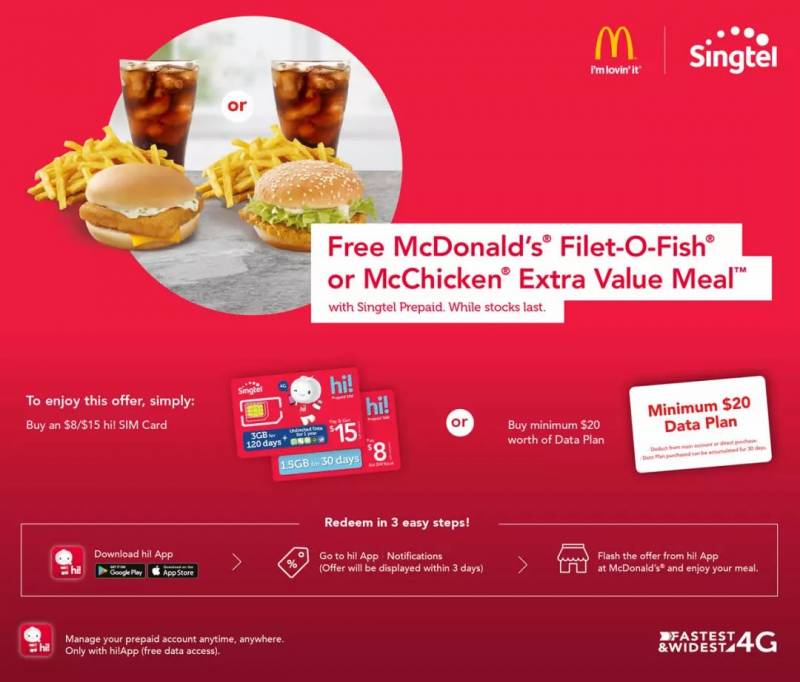 买Singtel预付卡,下载并出示hi!App,即可获得免费鱼柳包或麦香鸡套餐。