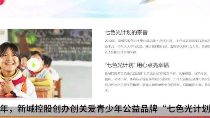 在新城控股官网上,该集团还重点宣传其大型公益项目“七色光计划”,该项目由王振华亲自参与,主要帮扶对象是贫困地区的青少年。