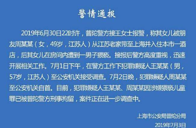 带女童入住酒店的女子周某也已到案。周某49岁,江苏徐州人。据其供述,事发当天,她带了两个女孩入住酒店,一个9岁,一个12岁。两个女孩的母亲为周某朋友。周某谎称带两女孩去上海迪斯尼玩,从江苏带至上海。当天王某对9岁女童实施犯罪,事后给付周某现金1万元。
