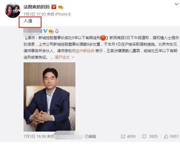 《新民晚报》7月3日报导,57岁的房产上市公司新城控股董事长王振华,因涉嫌猥亵9岁女童,于7月1日在上海被刑事拘留。
