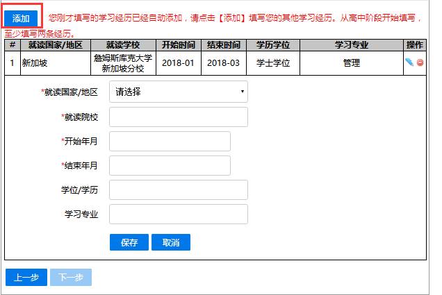 前面填写完在JCU本科/硕士的留学经历之后,这里还需要添加一个高中学历;如果你认证的是硕士学历,那么依旧需要从高中阶段开始填写。这里要注意的是,就读学校一定要提供全称(例如:厦门市第一中学/西安交通大学第二附属中学),此处“学位/学历”填写高中,专业不需要填写。如果还需要填写本科学历,那么根据要求进行添加。