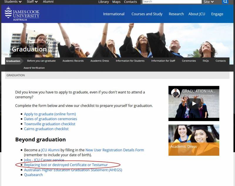 如因毕业年代久远,或由于种种原因毕业证书和成绩单丢失,这里可以到JCU的网站申请新的证书和成绩单。