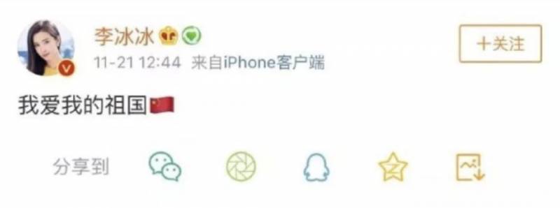 李冰冰则发微博表示:我爱我的祖国。